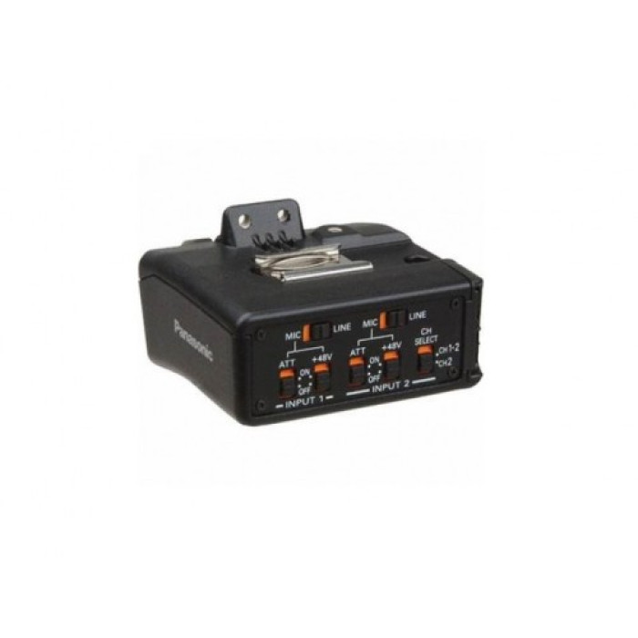 The Panasonic AG-MYA30G is an integrated XLR input adapter and microphone holder designed for use with the AG-HMC40, AG-DVC30 and AG-DVC32 video cameras. The unit features 2 XLR inputs that can be independently switched to accept mic-level or line-level signal. An attenuation switch (ATT) increases headroom when using exceedingly "hot" microphones that overload the input and cause distortion. Each channel is equipped with its own level control and the adapter will supply +48V phantom power to condenser microphones.