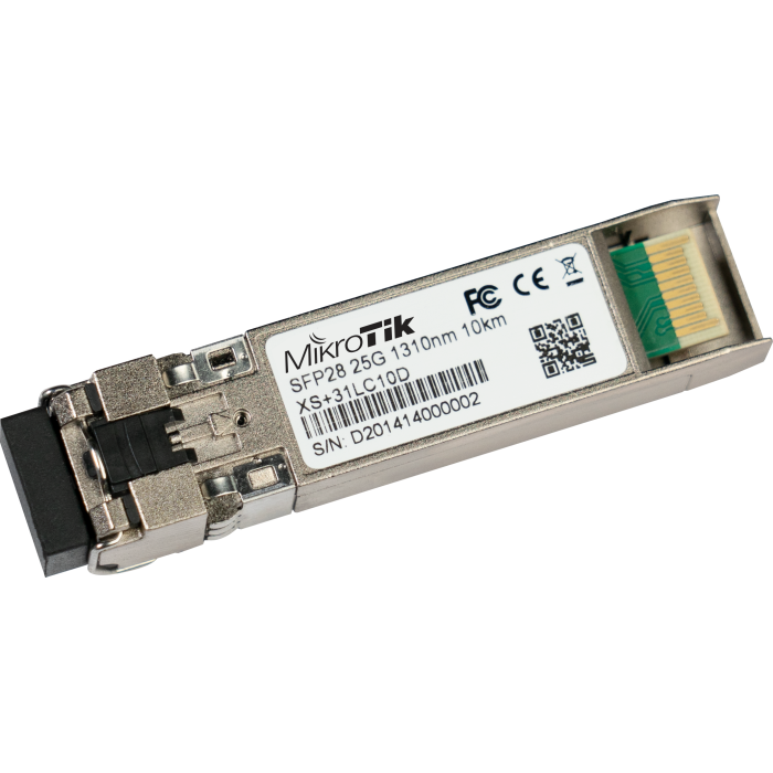 The MikroTik XQ+31LC10D is a 100 Gigabit QSFP28 optical module for single-mode connections over distances of up to 10 km, designed for high-speed backbone links between buildings, campuses, and distributed network nodes where distance exceeds the range of short-reach modules. It is widely used in ISP infrastructures, metropolitan networks, enterprise campuses, and distributed datacenter environments where 100G connections over single-mode fiber between remote locations are the standard requirement. Compatibility with the CCR2216, CRS504, and CRS518 provides direct integration into the MikroTik 100G switching and routing ecosystem.