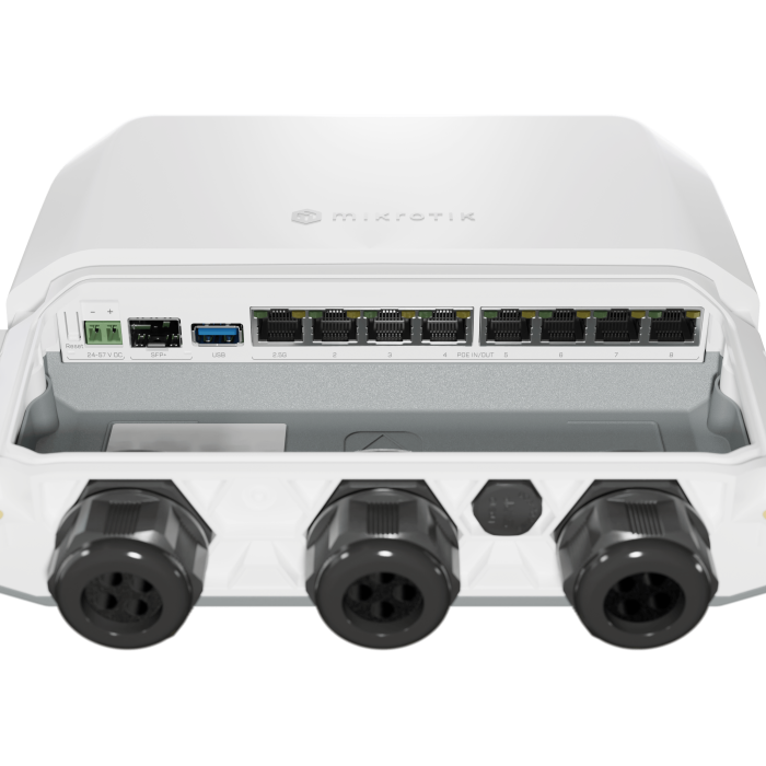 Like the indoor version, this RB5009 has 7x Gigabit Ethernet ports, one 2.5 Gigabit Ethernet port, a 10G SFP+ cage, and a full sized USB3 port!