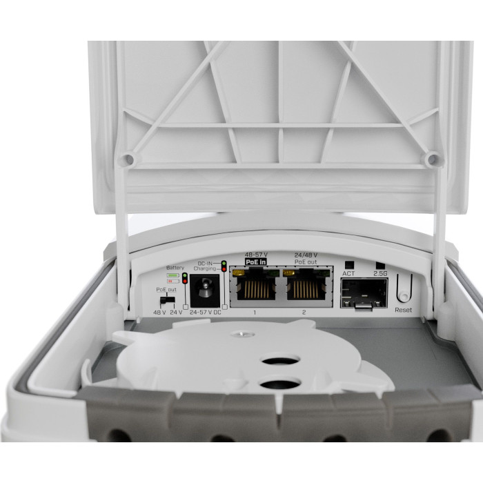 What makes the FTC21-ups truly unique are the two built-in Li-Ion NCA 18650 batteries. Not for running your network all night, but for surviving critical moments. At ~3W consumption (SXT LTE7 kit), the batteries provide 6+ hours of autonomy. At ~5–7W (LHG 5), 1–2 hours, and at ~13W (Cube 60Pro), 45–55 minutes — enough to prevent any renegotiation or connection loss during a short power interruption. The battery is intelligently managed: inactive during shipping, activated on first power-up, and can be remotely put into ship mode via SwOS when necessary. The FTC21-ups runs SwOS Lite with a full feature set: interface monitoring and management, VLAN support, SNMP reporting, basic traffic shaping and advanced packet filtering with Access Control Lists based on Layer 2, 3 and 4 conditions.
