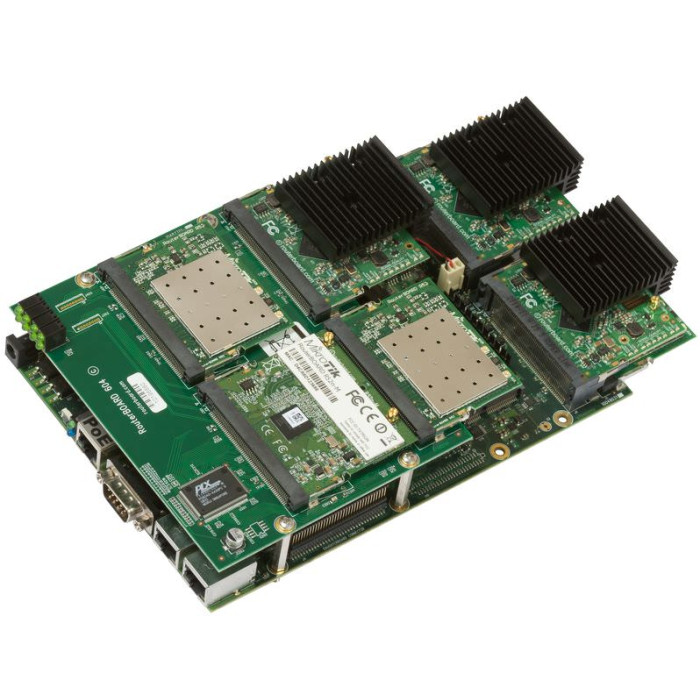 The RB800 is an advanced high performance wireless platform. It has four miniPCI slots, three Gigabit ethernet ports, two daughterboard connectors (one PCI and one PCI-e), a miniPCI-e slot and a compact flash slot.