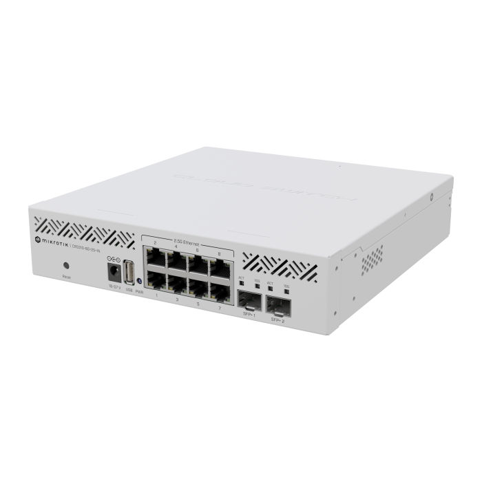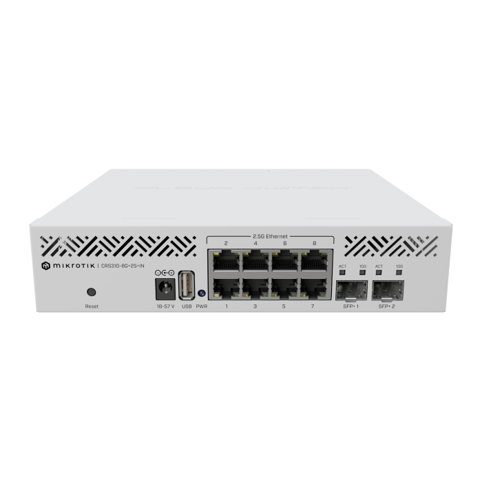 The CRS310-8G+2S+IN also has a built-in switch chip that provides hardware acceleration, resulting in fast forwarding rates and reduced CPU load.What sets this switch apart is its "Intelligent Network" (IN) feature, which allows for automatic detection and configuration of Mikrotik devices connected to it. This simplifies network setup and maintenance, saving users time and effort. Additionally, the CRS310-8G+2S+IN is powered by RouterOS, Mikrotik's renowned operating system, enabling advanced management and monitoring capabilities.Overall, the Mikrotik CRS310-8G+2S+IN is a reliable and feature-rich network switch that combines high performance, versatility, and ease of use.