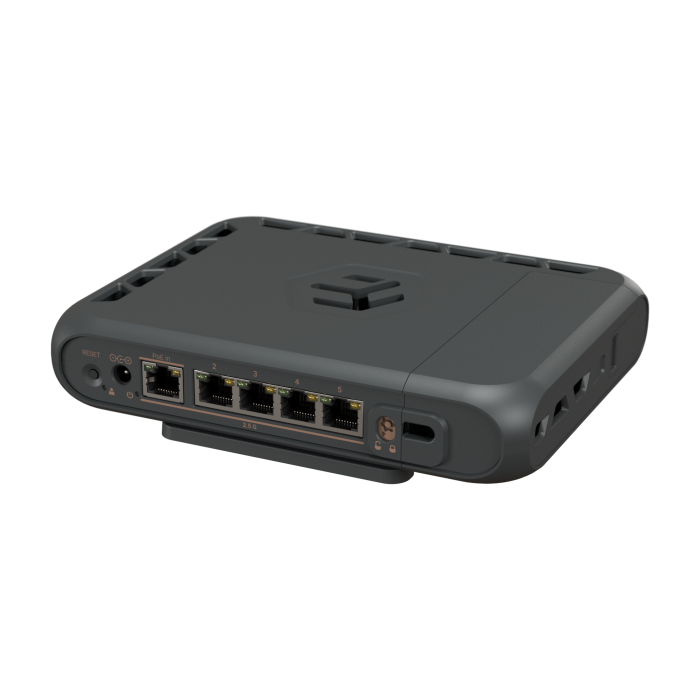 Equipped with wireless bands of 2.4 GHz (4 dBi antennas, 574 Mbps RX / 688 Mbps TX), 5 GHz (7.5 dBi antennas, up to 2882 Mbps), and 6 GHz (8 dBi antennas, up to 5764 Mbps), hAP be³ Media delivers higher throughput, lower latency, and clean spectrum on the wide 6 GHz band to reduce congestion in busy environments. All 5x 2.5G Ethernet ports eliminate bottlenecks for ultra-fast ISP uplinks, NAS servers, and workstations. PoE-In 802.3af/at support (24-57V) and DC jack (24-57V), max power consumption 20W without attachments (29W total), and full container support with simple one-click setup in WinBox for dashboards, custom services, and local applications.