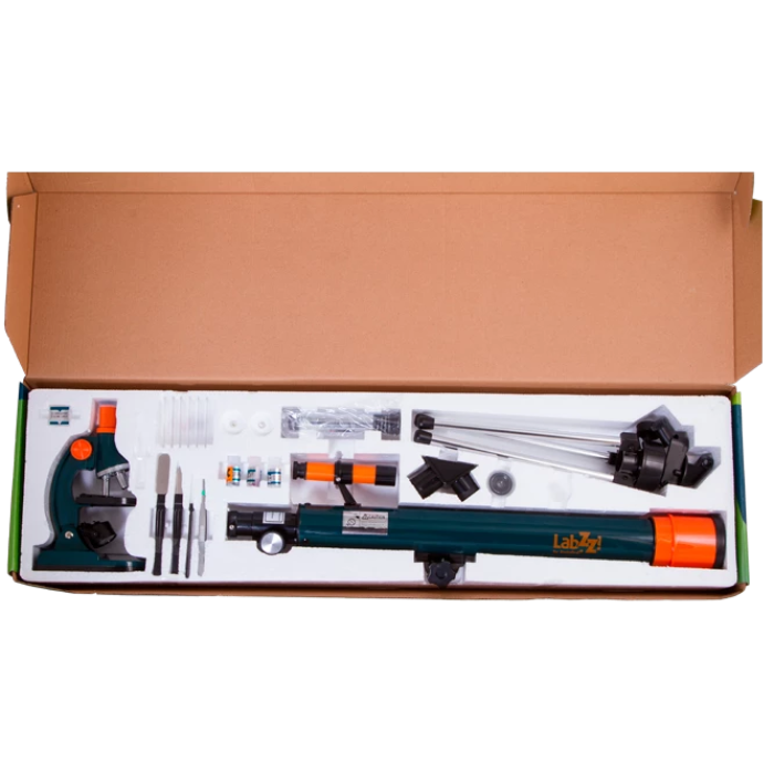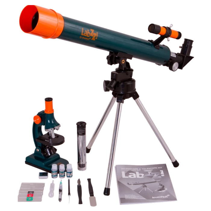 A wealth of interesting discoveries awaits your kid with Levenhuk LabZZ MT2 Microscope & Telescope Kit! The kit includes a biological microscope with an experiment set and a refracting telescope. These instruments feature high-quality optics, reliable design, and convenient use. The guide is written especially for the youngest explorers in a user-friendly and easy-to-read manner. The kit is designed for children over 6 years of age. Teenagers will also enjoy exploring the skies or the micro world with Levenhuk LabZZ MT2.