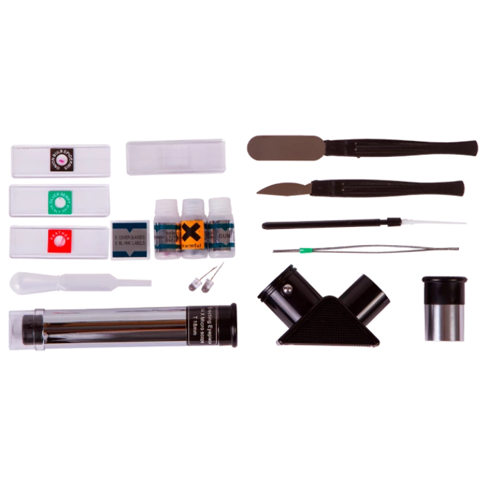 The kit includes everything needed for working with the microscope, as well as an extensive set of ready-to-use microscope slides and instruments for preparing new slides.